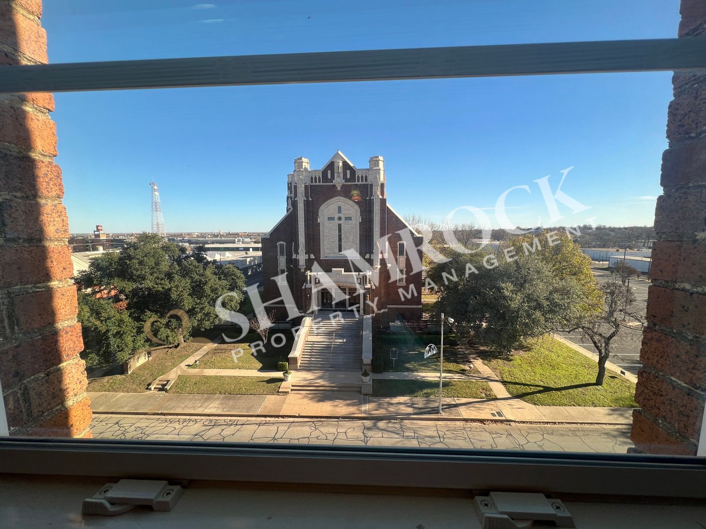Unit 501 is a corner unit that has a stackable washer/dryer and offers stunning views of Austin Avenue Methodist Church from the living room and bedroom!